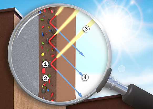 A cool pigmentek reflexiós hatása miatt a napsugárzás visszaverődik, ezért a vakolat nem melegszik fel.