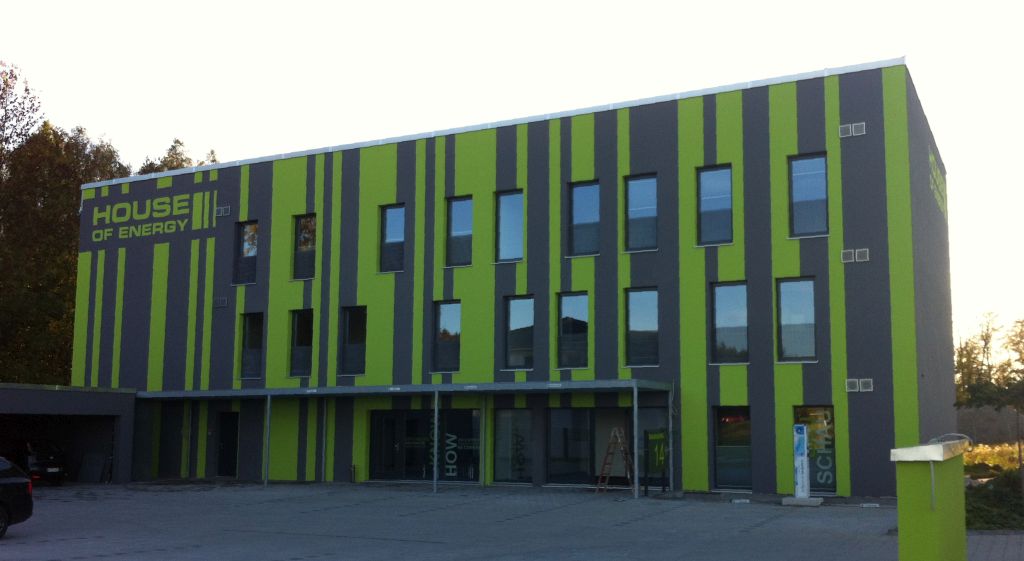 A németorsszági Kaufbaurenben épült Hause of Energy Passiv House Plus standardnak megfelelő irodaház homlokzata 24 cm-es Baumit ProTherm hőszigetelő rendszerrel készült neonzöld-szürke StyleTop vakolattal.