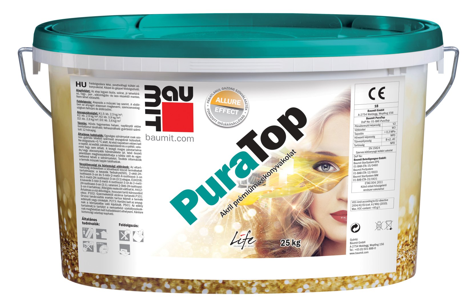 A hazai és nemzetközi építészeti trendekben, de egy „átlagos” magyar családi ház építésében is megjelennek a nagy felületet betöltő sötét vagy élénk színek, színösszeállítások. A Baumit PuraTop vékonyvakolat 114 erős színben rendelhető, a halványabb árnyalatú, de élénk színektől az egészen sötét tónusokig. A színkeverés kizárólag gyári körülmények között készül, a megrendelést követően a vödrös kiszerelésű vakolatot a Baumit térítésmentesen kiszállítja a kereskedőhöz vagy az építkezés színhelyére.