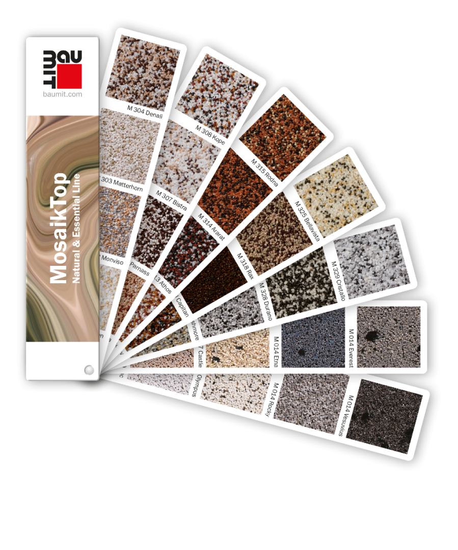 Eredeti Baumit Mosaik és struktúraminták könnyen hordozható kártya formátumban: a Baumit Life 30 lábazati vékonyvakolatának színében. Praktikusan használható építkezéseken is.